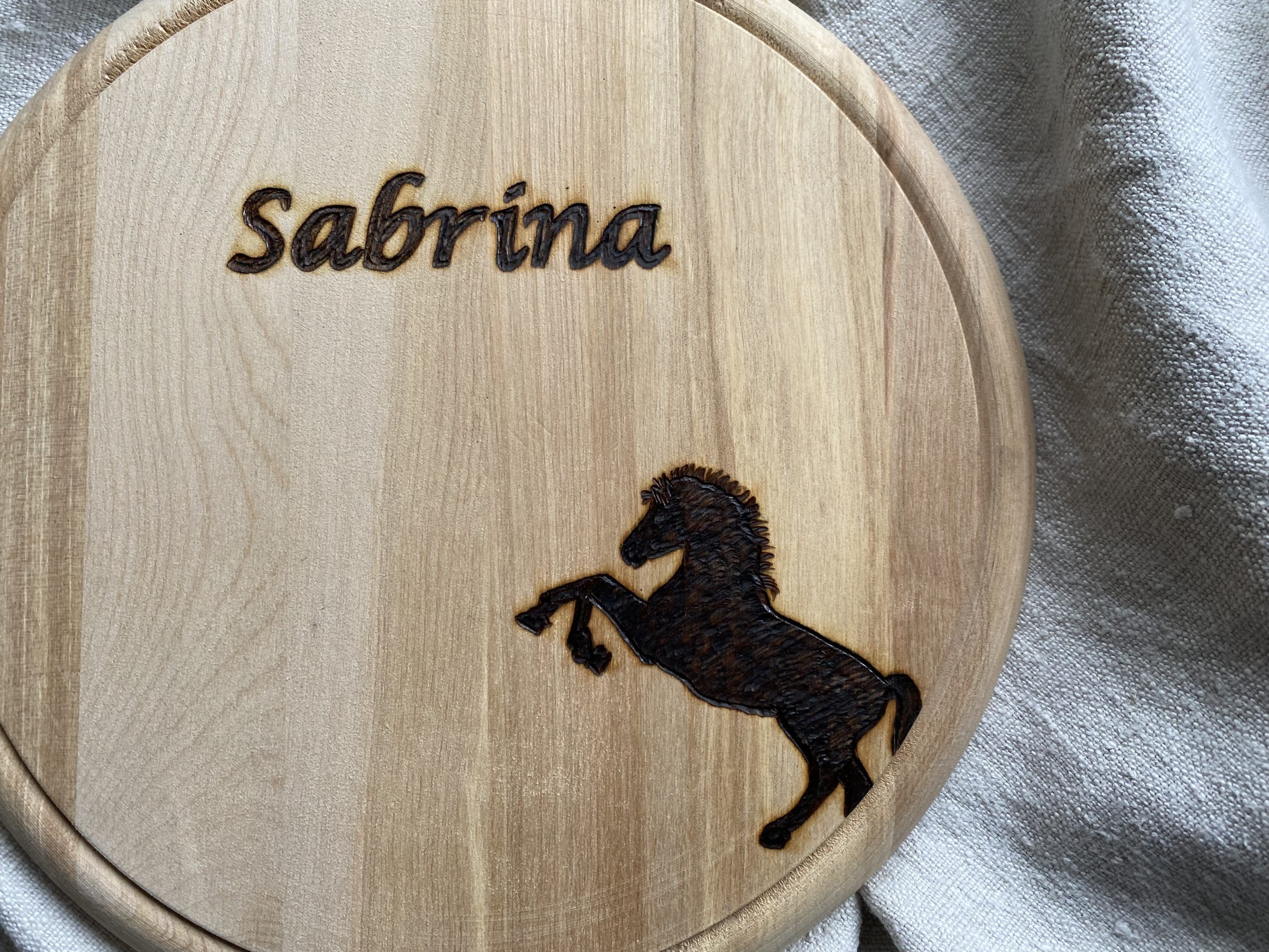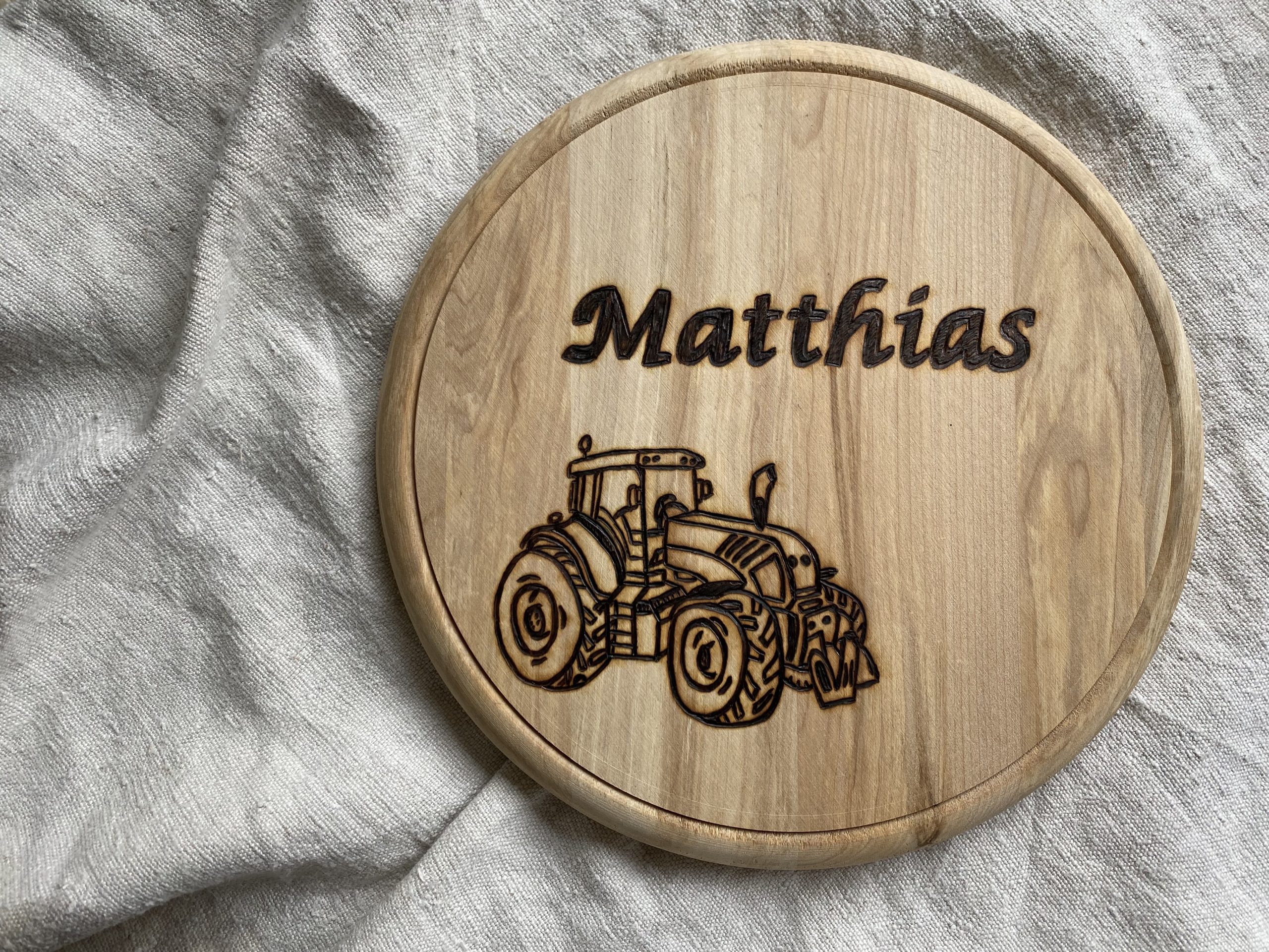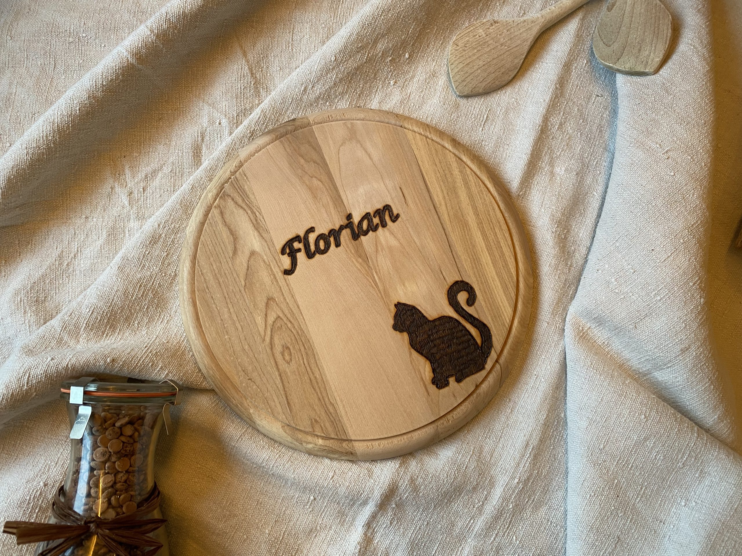 Das Brotzeitbrett hat einen Durchmesser von ca. 25cm. Da es ein Natur-Holzprodukt ist, besitzt jedes Brett eine individuelle Maserung.